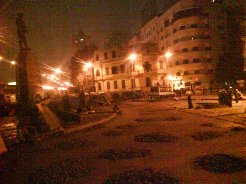 صور الشهداء رفعت في اطراف الميدان تظللنا وتحمينا وتدفعنا الا نغادر قبل محاكمة السفاح.. جرائد اليوم نشرت صفحاتها علي الجدران. الخيم البلاستيكية. الأطباء نقلوا نقاط العمل متقدمين حول المتحف وبعد أول نقطة تفتيش ودفاع من المعتصمين . الأطباء أقاموا ايضا معرضا لملابس ومتعلقات الشهداء. للاسف اطباء لجنة الاغاثة والاطباء العرب الذي ظهروا بكثافة منذ الامس اقاموا في المستشفى الميداني بالمسجد / الزاوية مما اضطر الاطباء الذين تواجدوا طوال الوقت منذ ٢٨ يناير الي الخروج من المستشفى ووزعوا انفسهم في نقاط اكثر بالميدان. لا توجد اصابات اليوم فقط تغيير علي الجروح ونحوه. كل المداخل امنة تماما لكن مدخل عبد المنعم رياض للخروج فقط. دبابة كوبري ٦ اكتوبر التي تحمي من صعود البلطجية كانت موجودة حتى السابعة مساء ثم تحركت لكن حركة السيارات أعلى الكوبري طبيعية جدا. اذن خطوط الدفاع من المعتصمين تليها بعض الدبابات ثم صف جنود ثم بعض الدبابات ثم خط الدفاع الثاني بخلاف نقطة عبد المنعم رياض تبدز بخط دفاع ثم نقطة الاطباء والاسعاف الأولى ثم الدبابات التي يتحلق اسفلها المواطنون. احدهم مزارع اخذ يخاطب الحاضرين حول تدهور الاحوال خاصة في مجال الغذاء والزراعة ويوجد فيويو لاحقا لحديثه المنطقي والمؤثر. احد المواطنين كان يعالج من السرطان واستاصل جزئيا ورما في المخ واصيب الاربعاء في راسه وعينه اليمنى، ويوجد فيديو مطول معه عن سبب اشتراكه بالاعتصام واستمراره رغم اصابته البالغة ومرضه. بائع المش. صور لبعض غنائم العربجية من سروج ولجامات للبغال التي كانوا يمتطوها يوم الاربعاء. مزيد من الباعة. متظاهر كتب: اسمي مايكل ومتظاهر رغم انف (البابا) شنودة. احد اطفال الشوارع مصطفي ضرب بقسوة يوم ٢٨ يناير في حلوان وكل يوم يزتي معنا للاعتصام وتصادق مع اخر اصغر منه عمرا ياتيمع والديه ووجد عملا لدي مصطفى صاحب ورشة (وهو الذي يرسم ويكتب الشعارات على الخوذات المعدنية الصفراد) بعد النصر ان شاء الله . صلاة المغرب وتري احد السيدات خلف صف الرجل وترفع خلفها علم مصر.